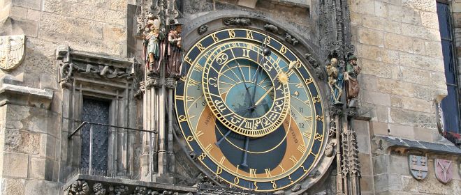 Σήμα κατατεθέν της Πράγας, το γοτθικό αυτό ρολόι βρίσκεται στον πύργο του παλιού Δημαρχείου. Μην χάσετε το θέαμα μόλις η ώρα χτυπήσει ακριβώς:  Η φιγούρα του Θανάτου κτυπάει ένα καμπανάκι και οι 12 Απόστολοι εμφανίζονται από πάνω. Ένας κόκορας ακούγεται και το ρολόι σημαίνει την ώρα. Τότε βγαίνει ένας Τούρκος που κουνάει το κεφάλι του με δυσπιστία, ένας Τσιγκούνης που κοιτάζει το πουγκί του με το χρυσάφι, και η Ματαιοδοξία που θαυμάζει τον εαυτό της σε ένα καθρέφτη.