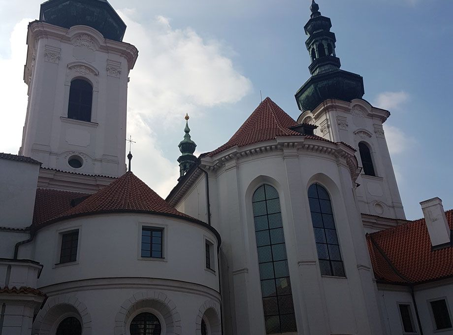 Το μοναστήρι, το οποίο έγινε γνωστό ως το μοναστήρι του Στράχοφ, δεν ήταν ιδιαίτερα γνωστό ως το 1143 όταν μια ομάδα Πρεμονστρατενσιανών εγκαταστάθηκε εκεί.  Η περιοχή του μοναστηριού περιλαμβάνει την Εκκλησία του Αγίου Ροτς, την Εκκλησία της Αναλήψεως της Θεοτόκου, όπου ο Μότσαρτ λέγεται ότι έπαιξε το εκκλησιαστικό όργανο το 1787, την Πινακοθήκη του Στράχοφ, αλλά και την μοναδική βιβλιοθήκη Στράχοφ. Η εκπληκτικής ομορφιάς βιβλιοθήκη στεγάζεται σε μεγάλες αίθουσες οι οποίες είναι διακοσμημένες με τοιχογραφίες οροφής σε στυλ Μπαρόκ.  Η βιβλιοθήκη περιλαμβάνει περισσότερους από 130.000 τόμους, συμπεριλαμβανομένων 2.500 βιβλίων τα οποία εκδόθηκαν πριν από το έτος 1500, καθώς επίσης και 3.000 χειρόγραφα. Το πιο παλιό βιβλίο της βιβλιοθήκης είναι το Ευαγγέλιο του Στράχοφ το οποίο χρονολογείται από τον 9ο αιώνα